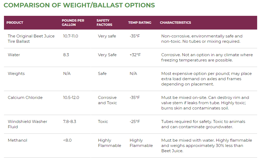 Advantages of beet juice are it is nontoxic and non-corrosive to wheels. TIRE SIZE GALLONS OF WATER ADDED WEIGHT lbs PER TIRE. I have a 2520 JD and the rear tires are ballasted with what I was told is Rim Guard beet juice.